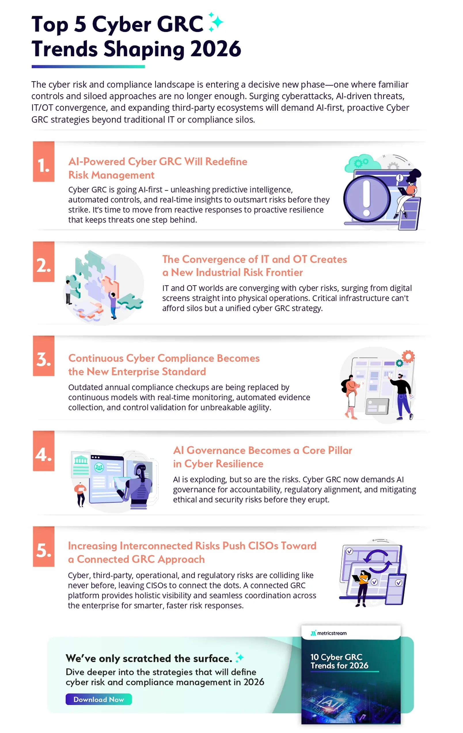 Against this reality, MetricStream’s 2026 Cyber GRC Trends highlight the most significant shifts that leaders must prioritize to build resilience, accountability, and confidence in the face of accelerating cyber risk. You can read all about the trends here – and here’s a look at the top 5 below.