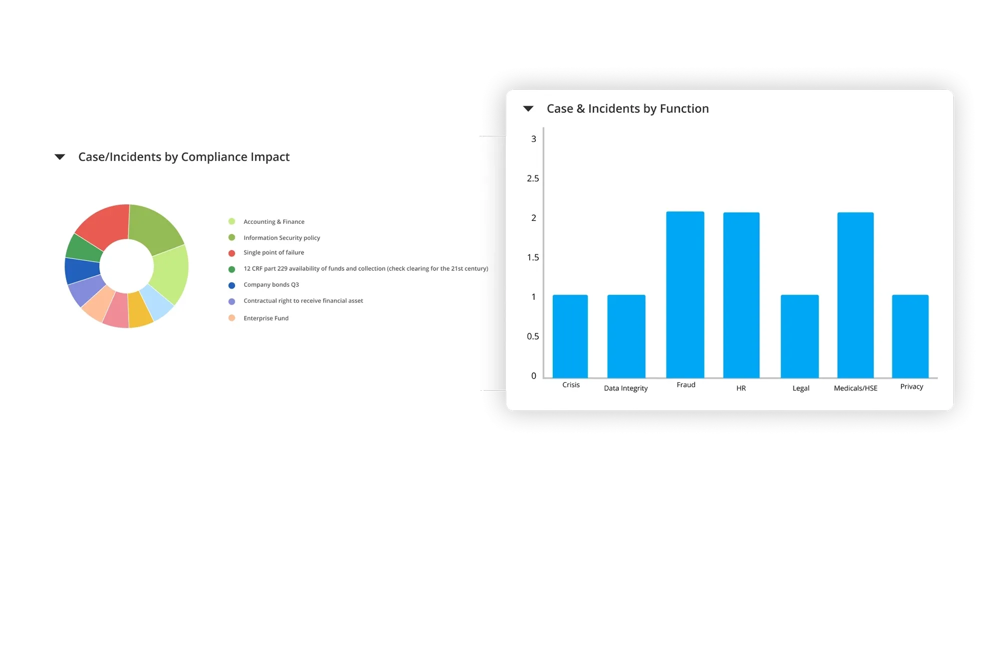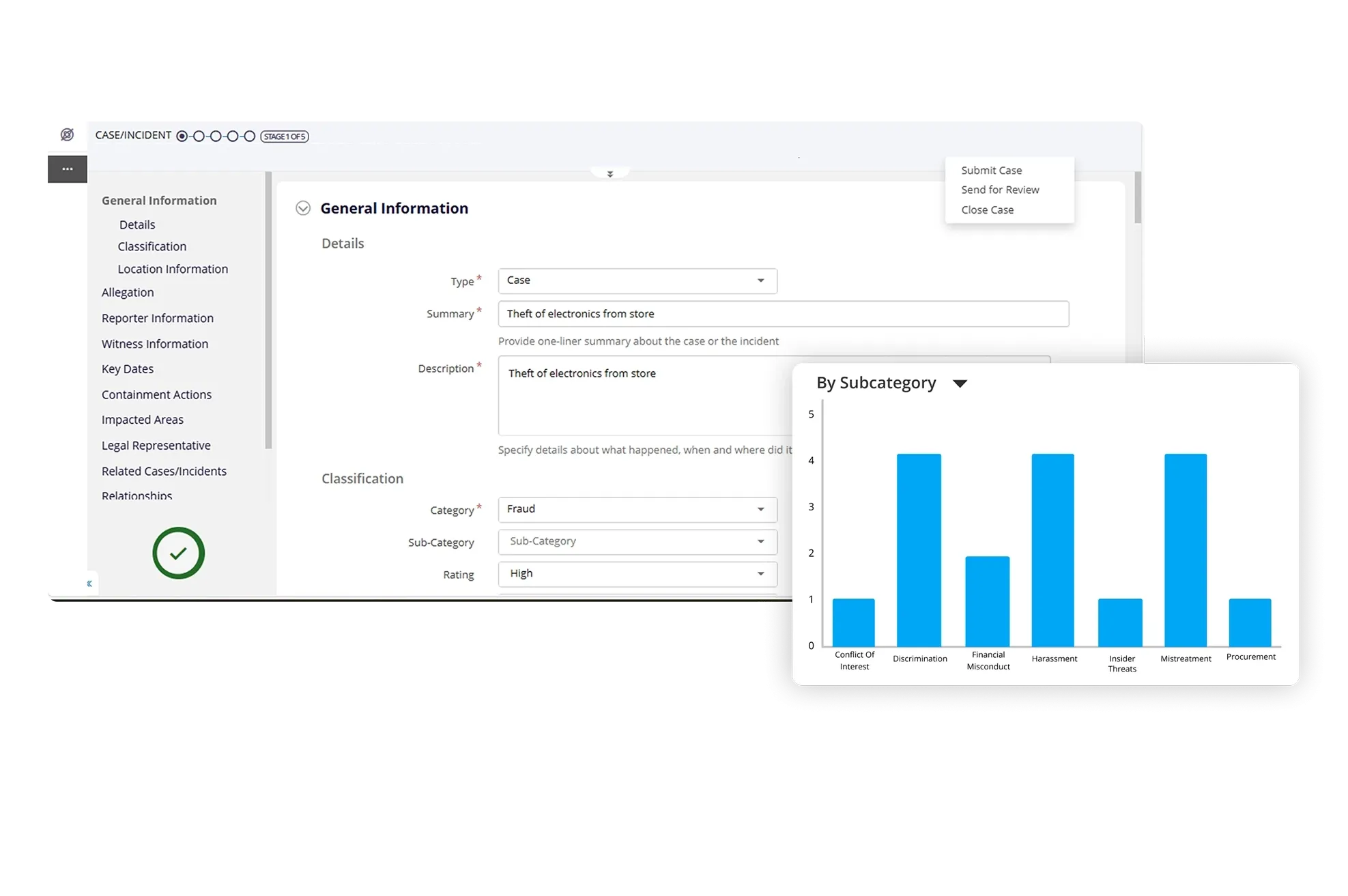 Directly report a case or incident in the product or trigger it from multiple sources, classify cases, and relate them to other incidents, policies, regulations, processes, and controls. Capture and classify cases and incidents based on pre-defined criteria, including severity levels.