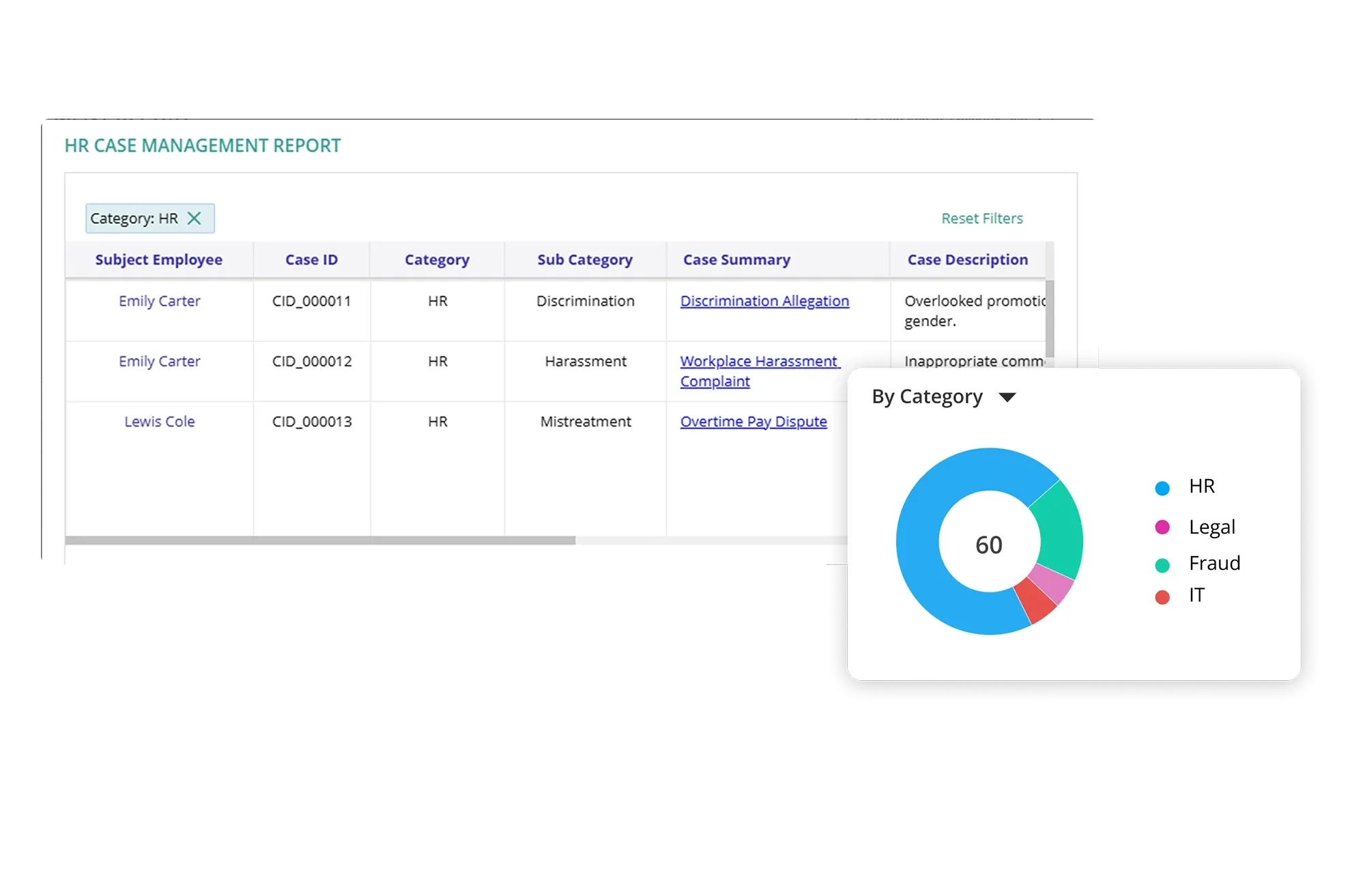 Gain comprehensive visibility into the case and incident management process and identify high-priority cases that need to be addressed using graphical dashboards with drill-down capabilities. Track cases and incidents in real time and leverage built-in analytics for trend analyses.