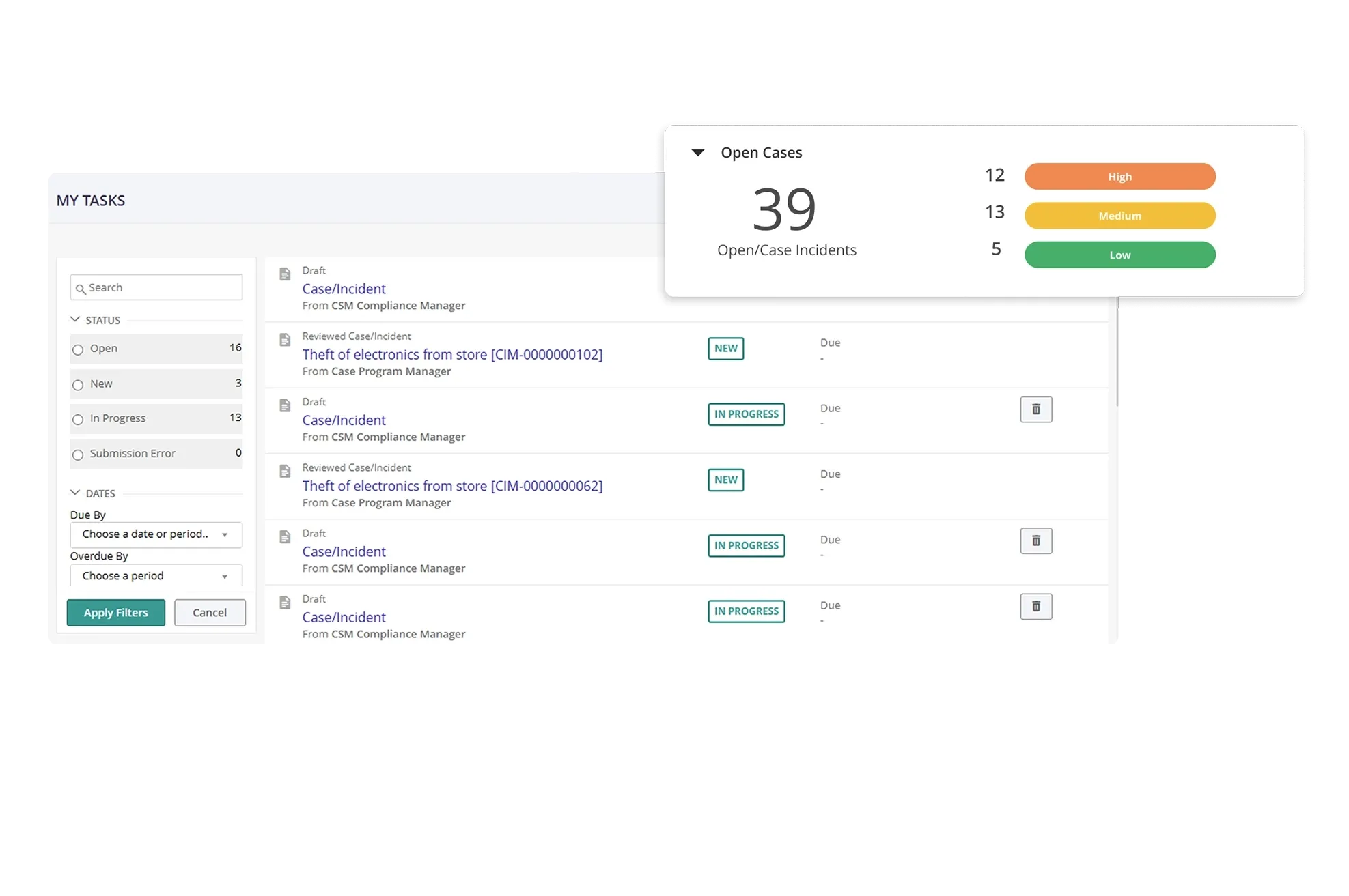 MetricStream Case and Incident Management software supports assigning investigators for investigating the case and collecting evidence. It enables the investigator to trigger investigations for each case to identify why it occurred, and who was responsible for it. You can assign investigative tasks to multiple users, enabling parallel investigations. Tasks are driven through collaborative workflows and clearly defined due dates. The case owner can closely track the investigations and capture the work done through audit trails and reports.