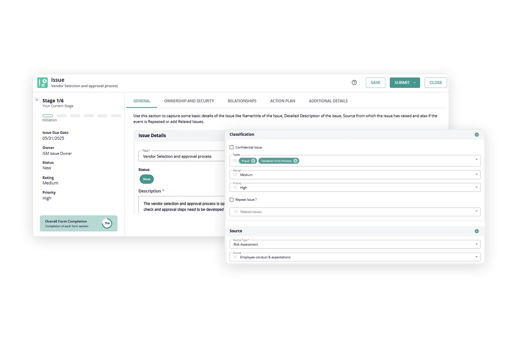 Automatically route the issue to an approver based on pre-configured workflows for review, approval, and resolution, along with supporting documents. The approver can cancel the issue if the issue is found to be inconsistent or invalid. Users can also classify issues as confidential where only a set of predefined and authorized users will see the issues and related data.