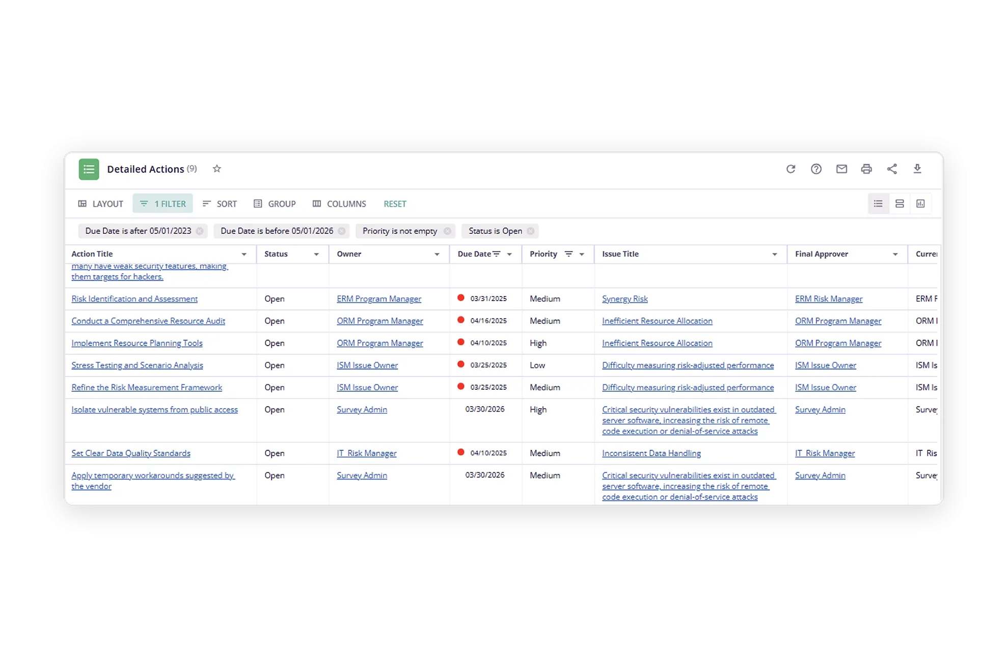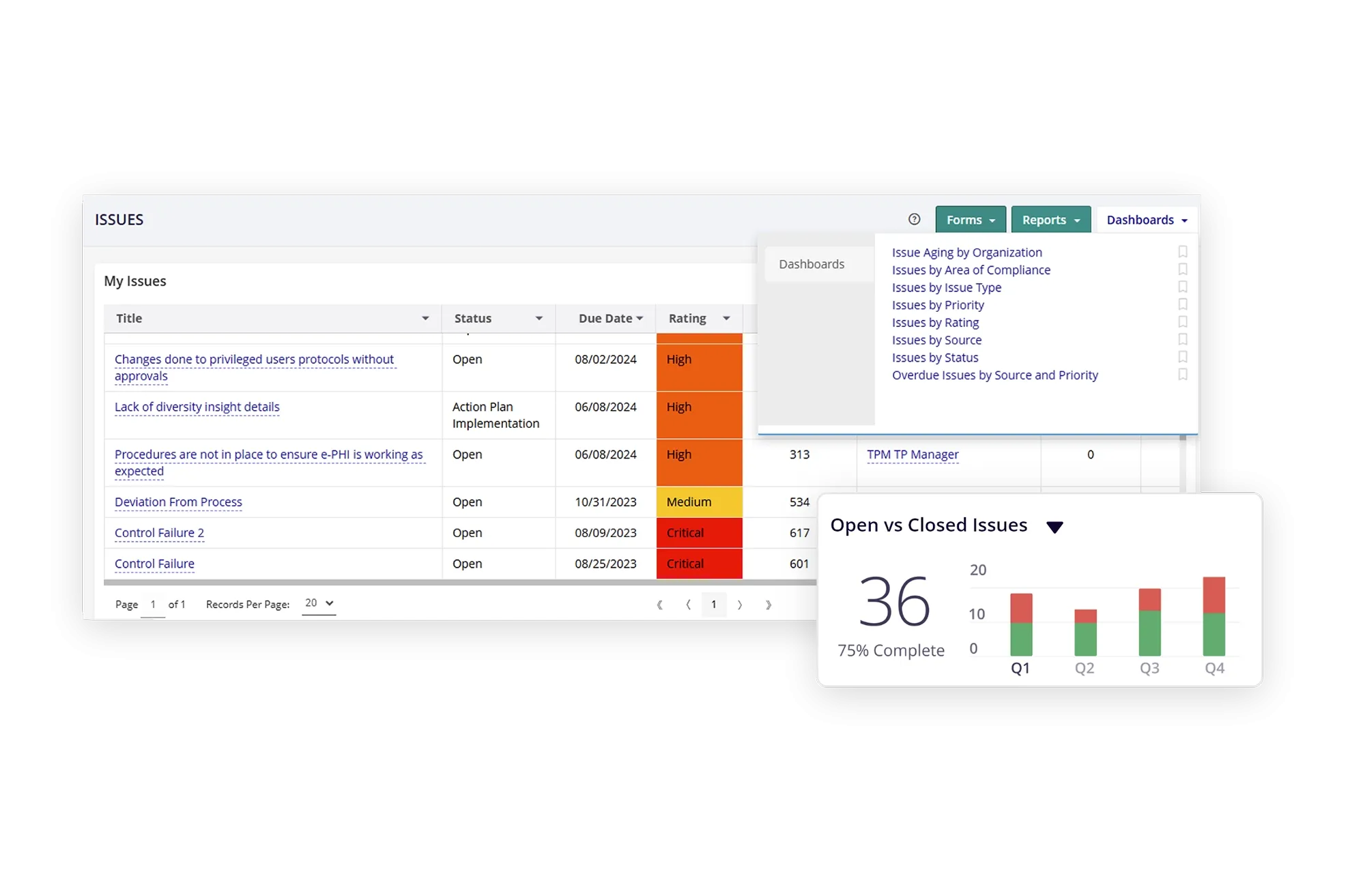 Enhance enterprise-wide visibility into issue and remediation management processes with executive dashboards and reports. With drill-down capabilities and rapid identification of high-priority issues that need to be addressed, viewers can gain real-time visibility into the issue and exception data for trend analysis. Issues can be tracked easily with issue triaging and status and action plan reports. Reports and dashboards can be easily configured in the system to meet customer-specific business requirements.