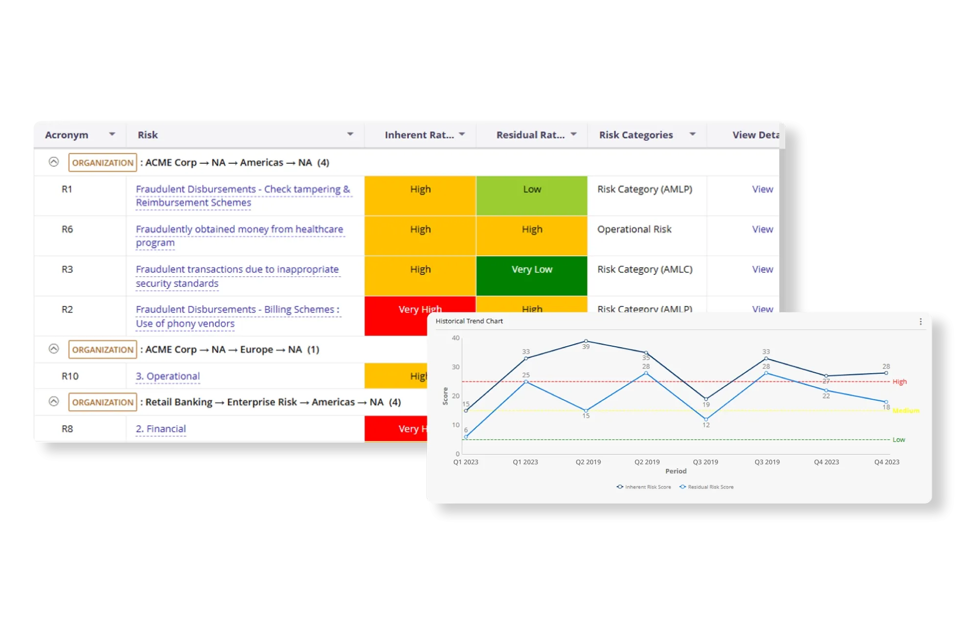 Leverage powerful dashboards and reports to gauge the performance of key metrics and analyze risk trends over a period of time to assess their performance and breach patterns. Gain real-time access to information on risk management across the enterprise. Through graphical charts, capture and track details on risk profiles, risk control self-assessments, control ownership, status of remediation, successes, failures, and trends. Report risks based on various dimensions such as the number of open issues for the risk, KRI trends, mitigating controls, and the number of risks falling within each risk level. Drill down to access the risk and control data at finer levels of detail.