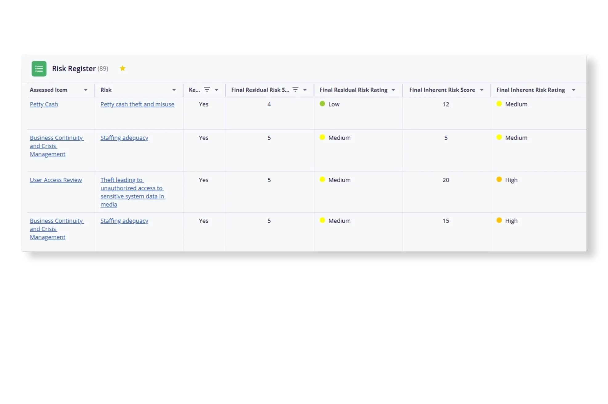 Leverage the centralized risk and control taxonomy to document, manage, and assess all risks faced by an organization. Create and maintain a risk register (library) of all risks with their key information, such as processes, risks, controls, products, areas of compliance, standards, assessments, entities, organizational profiles, functions, audits, and more.