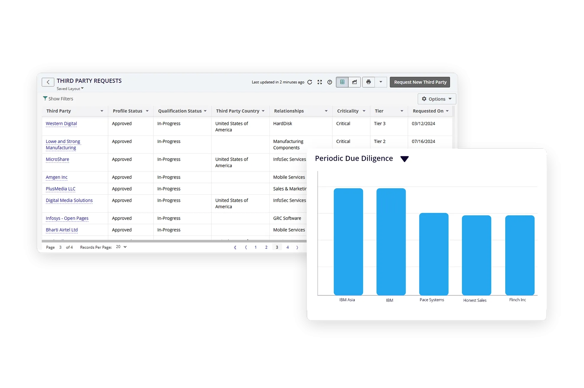 Simplify third-party intake across departments through a user-friendly portal. Automate the evaluation of risks for each third party or engagement and define the frequency of periodic assessments. Enable risks to be mitigated before onboarding. In addition, integrate with alerts from reliable external sources to screen and verify third-party information.