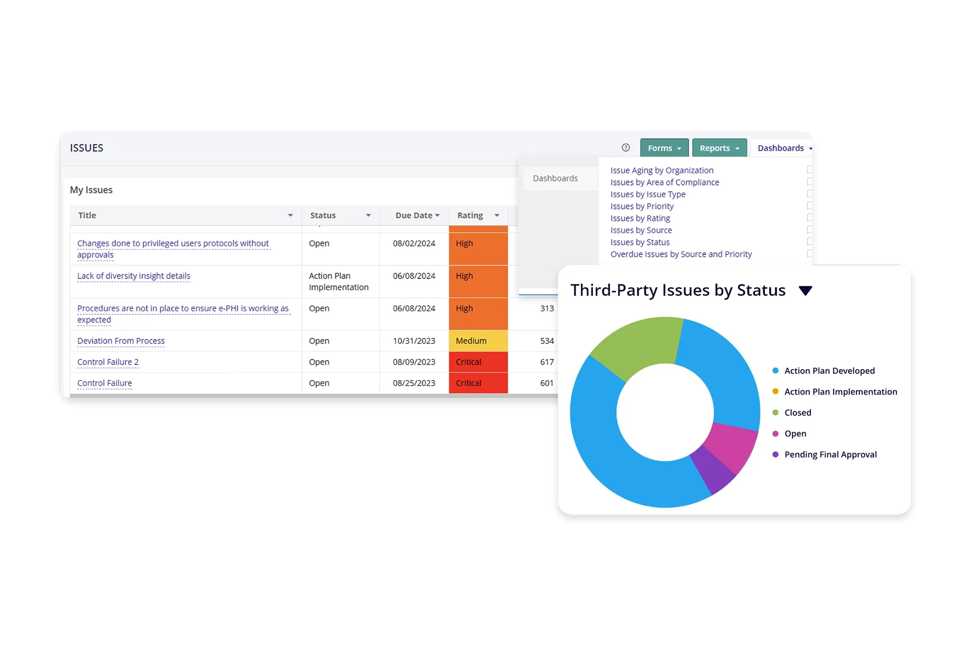 Leverage AI/ML to quickly identify issues based on relation and recommend issue classification. Automate creation, management, and monitoring of actions for issues and findings. In the event of a third-party contract breach or expiration, as well as incidents of non-compliance or dissatisfaction, simplify third-party off-boarding with in-built workflows and checklists.