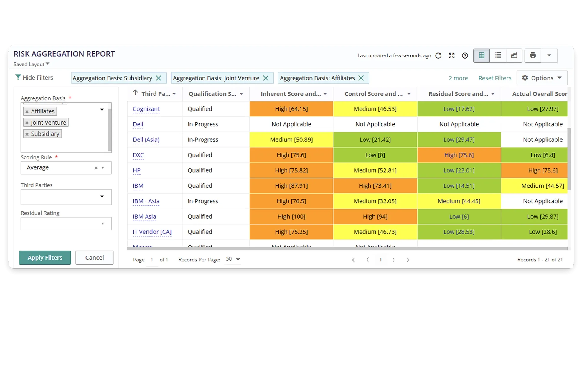 Assess and track each third party’s key performance indicator (KPI) scores leveraging assessments. Enrich internal scores with risk data from various internal systems, databases, content providers, and results of audits, assessments, and inspections. Leverage scorecards to monitor performance and proactively identify potential failures.