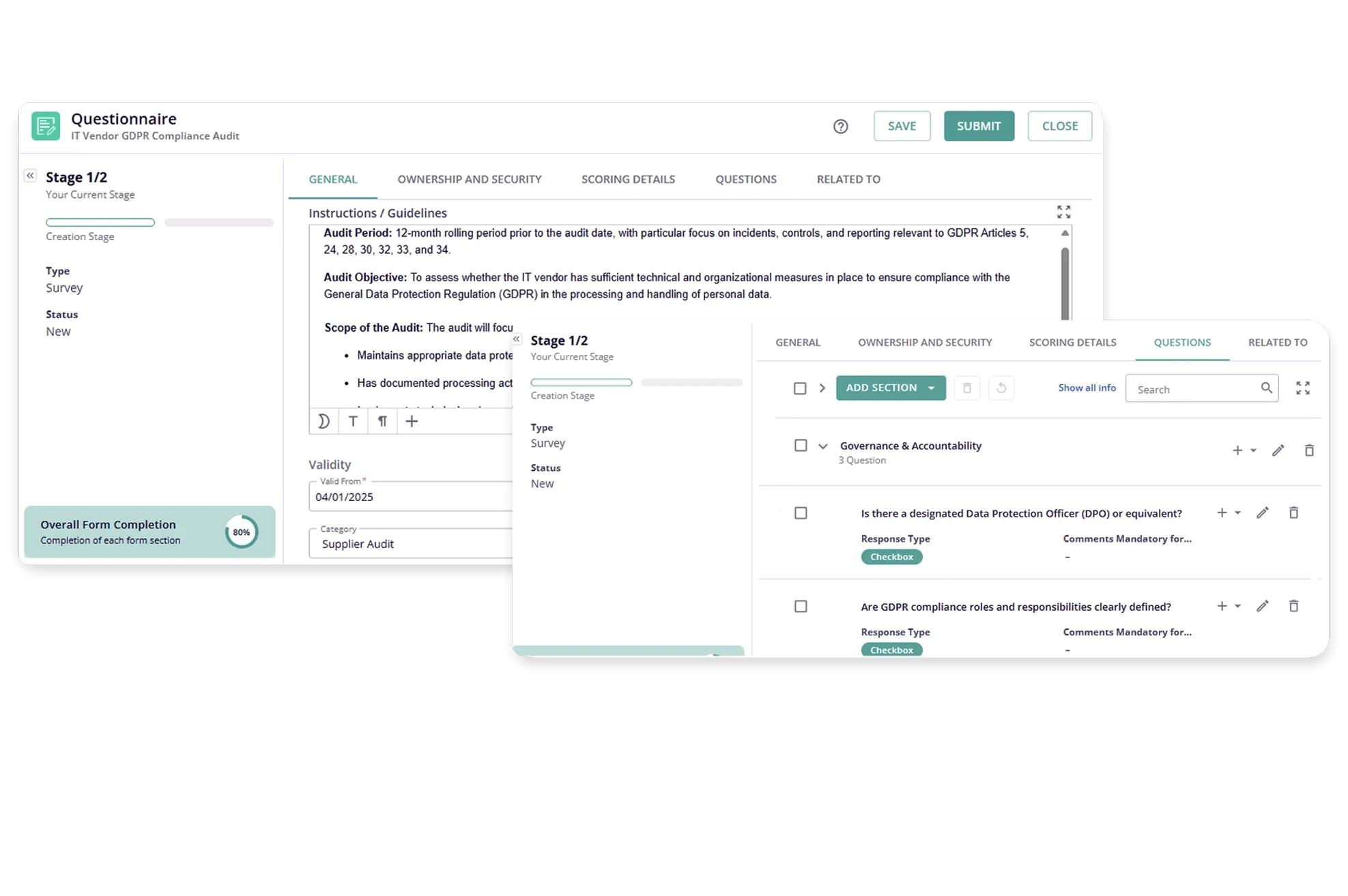 Enable consistent third and fourth-party risk and compliance assessments with pre-defined questionnaires. Conduct ad-hoc assessments based on risk intelligence from external sources, incidents, performance failures, or business insights. Automatically calculate risk scores based on the responses. Aggregate risk scores to determine the overall third-party risk posture.