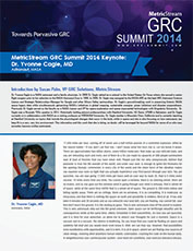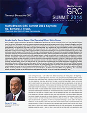 Pervasive GRC is MetricStream's vision for the future, representing our desire to help organizations build compliant, well-governed, risk-aware cultures, and to ultimately enable individuals, businesses, societies, and governments to thrive on risk. The MetricStream GRC Summit 2014 will bring together thought leaders, analysts, partners, and customers who at the forefront of making our vision of Pervasive GRC a reality.